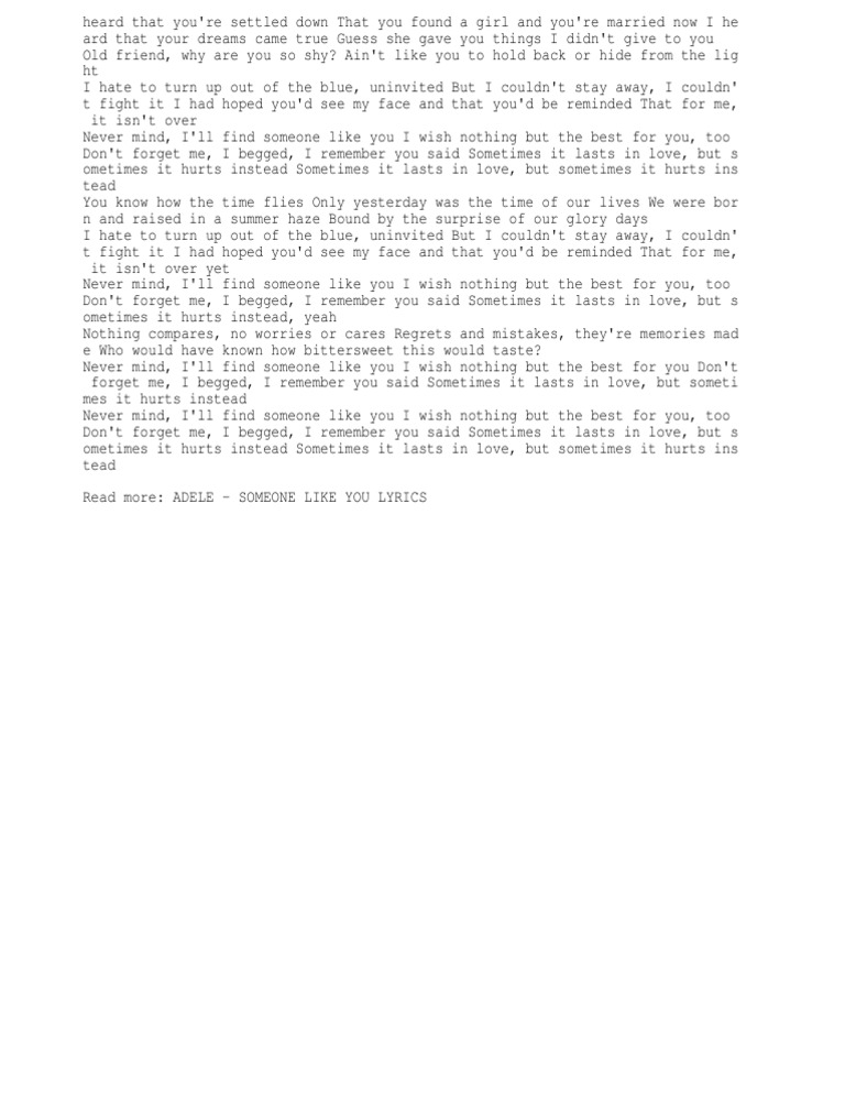 Never mind, i'll find someone like you i wish nothing but the best for you, too don't forget me, i beg, i remember you said sometimes it lasts in love, but sometimes it hurts instead sometimes it lasts in love, but sometimes it hurts instead. chorus: never mind, i'll find someone like you, i wish nothing but the best for you, too, don't forget me, i beg, i remember you said, sometimes it lasts in love, but sometimes it hurts instead, sometimes it lasts in love, but sometimes it hurts instead, yeah. Kam dëgjuar se je vendosur.