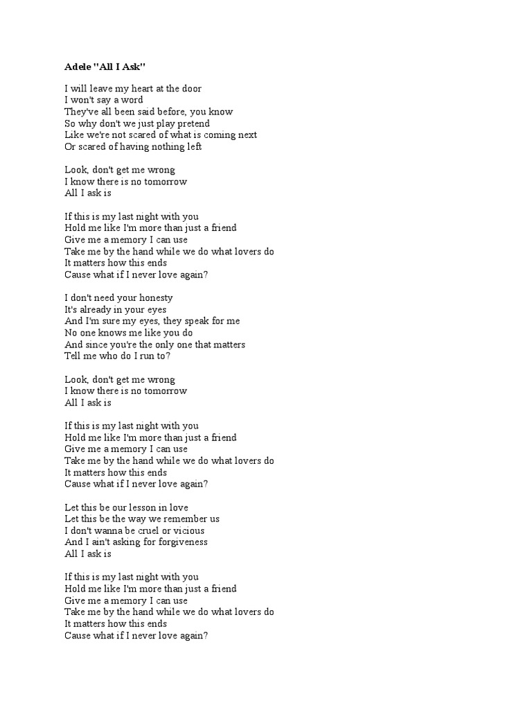 30+ Adele All I Ask Lirik PNG. Перевод песни all i ask — рейтинг: If this is my last night with you hold me like i'm more than just a friend give me a memory i can use take me by the hand while we do what lovers do it matters how this.