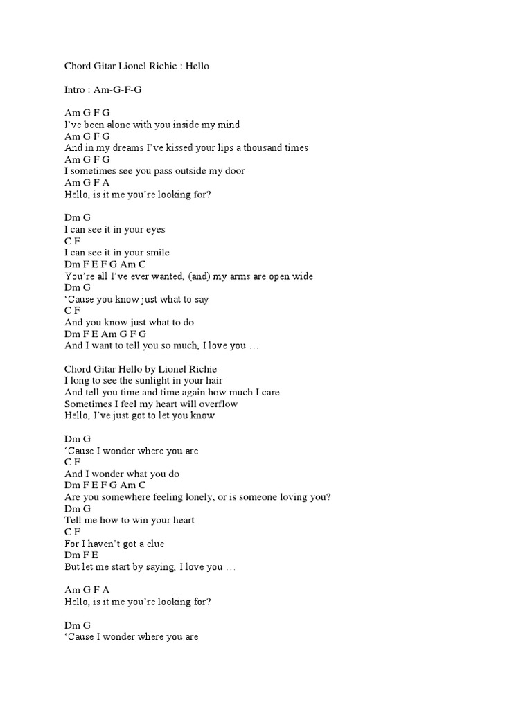 Download Hello Chords Lionel Richie Pics. 977,672 views, added to favorites 1,920 times. Kemzus intro am am/g f am/g am am/g f am/g verse am am/g f g i've been alone with you inside my mind am am/g f g and in my dreams i've kissed your lips a.