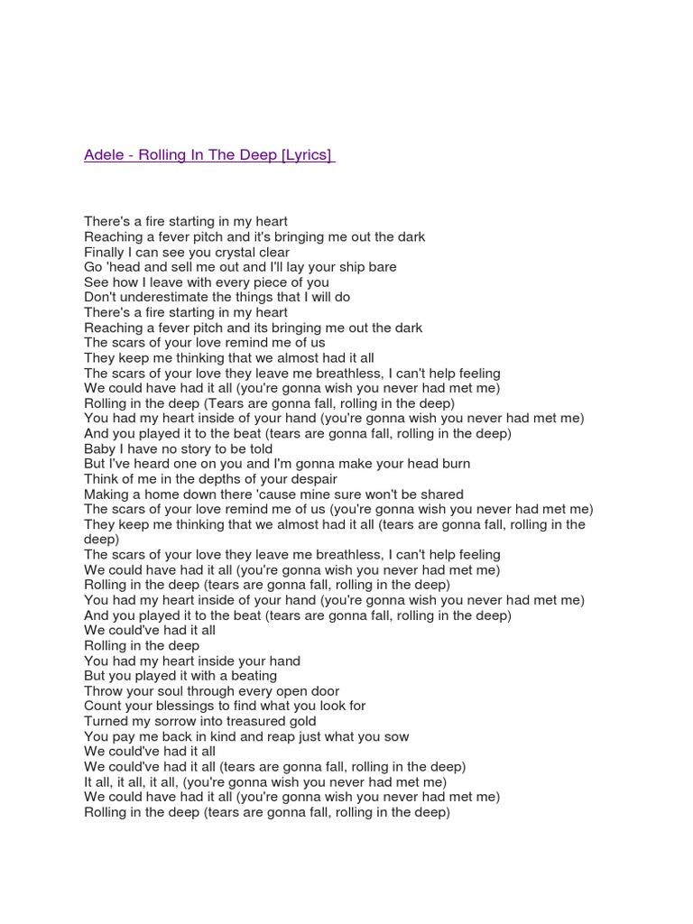 View Lyrics Adele Rolling In The Deep Pictures. Rolling in the deep) we could have had it all yeah (you're gonna wish you. It was my reaction to being told that my life is going to be boring, and lonely, and rubbish, and that i was a weak person if i didn't.